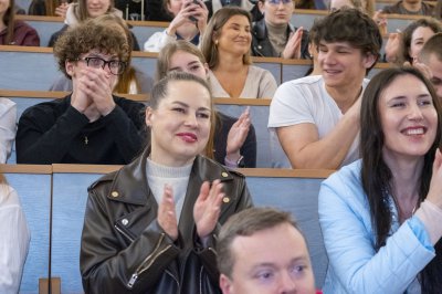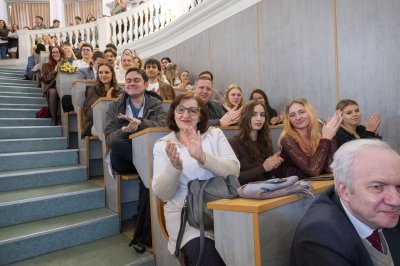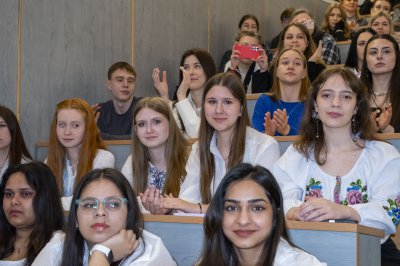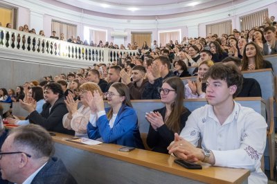На пленарному засіданні XXIII Студентської наукової конференції «Перший крок у науку – 2026» в актовій залі було б ніде впасти маковому зерну. Разом з викладачами та студентами ВНМУ у ній зібралися молоді науковці з Дніпровського медичного університету, Тернопільського медичного університету, Ужгородського медичного університету, Полтавського медичного університету, Національного медичного університету ім. О.О. Богомольця та Національного фармацевтичного університету.