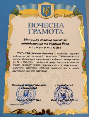 Психолог Університетської клініки та викладач кафедри педагогіки та психології ВНМУ Наталя Шатайло отримала Почесну грамоту Вінницької обласної військової адміністрації та обласної Ради за високий професіоналізм, відданість справі та значний внесок у збереження психічного здоров’я людей.