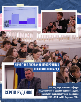 Доктор медичних наук, асистент кафедри ендоскопічної та серцево-судинної хірургії, завідувач кардіохірургічного відділення КНП «ВОКЛ ім.М.І. Пирогова ВОР» Сергій Руденко розповів про актуальні методи хірургічного лікування прострочених інфарктів міокарда, навівши приклади з клінічної практики.